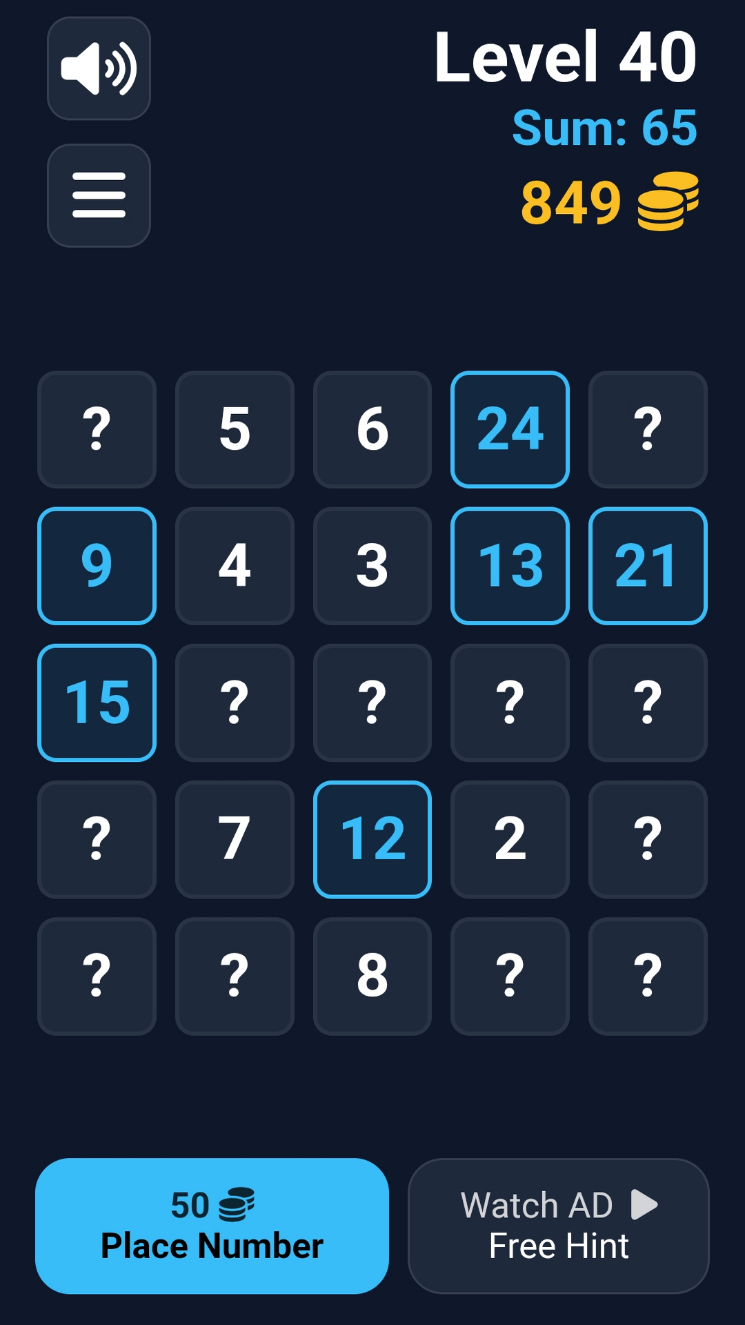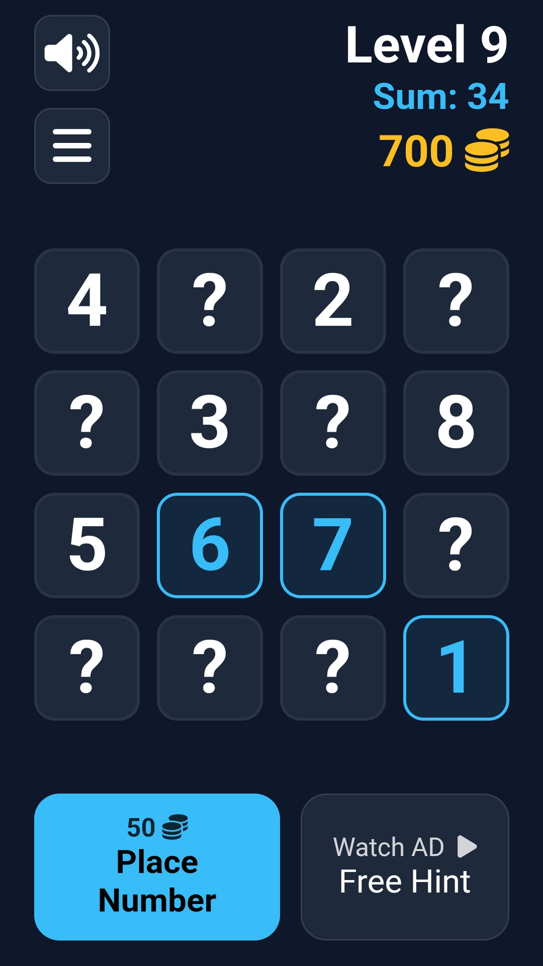 How to play: Your goal is to deduce the hidden numbers on the board using the clues provided. Every move brings you closer to the solution, but be careful: every decision counts! Use the "Hint" feature if you get stuck, and sharpen your skills with every level you clear.
